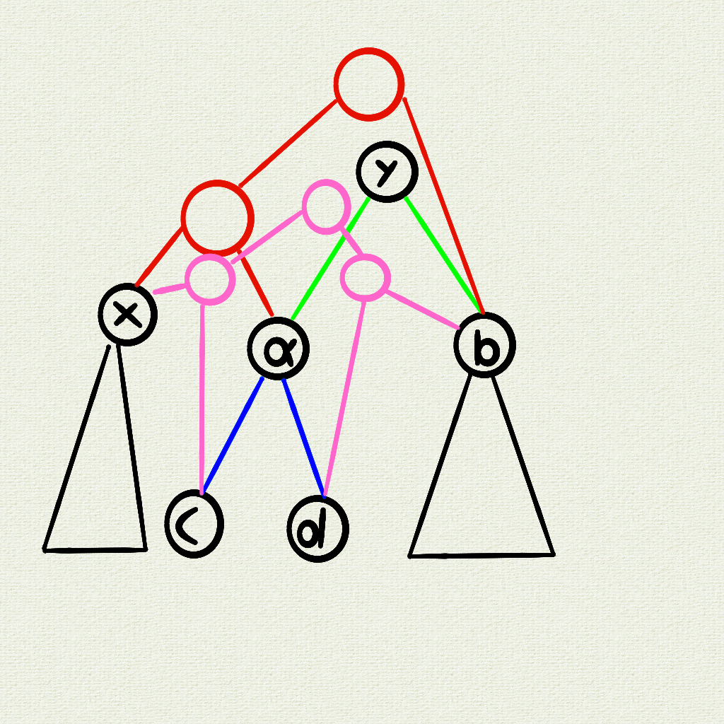 否则拆分 节点(断蓝边),连接粉色边。