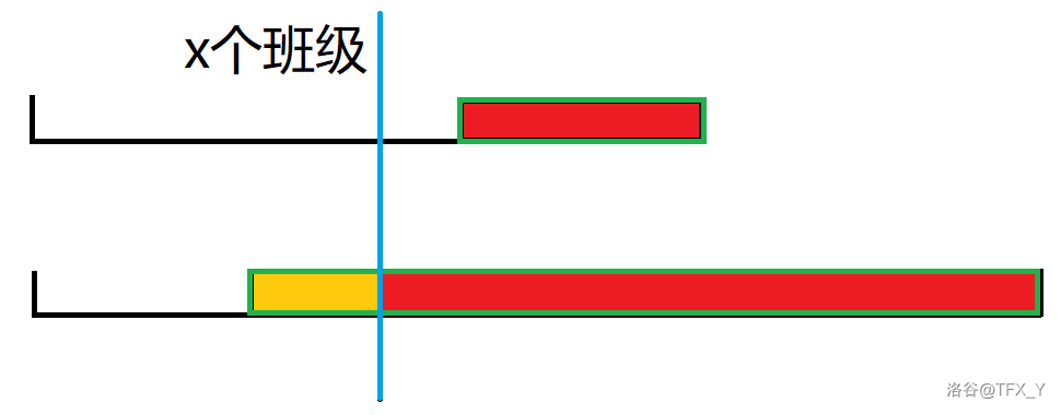 其中蓝线为 个班级,黑色线段表示学科老师能教的班级总数数,绿框表示一科中愿意去当班主任的老师数,红色部分即为要去当班主任的老师,而黄色部分由于要当任课老师,所以无法成为班主任。