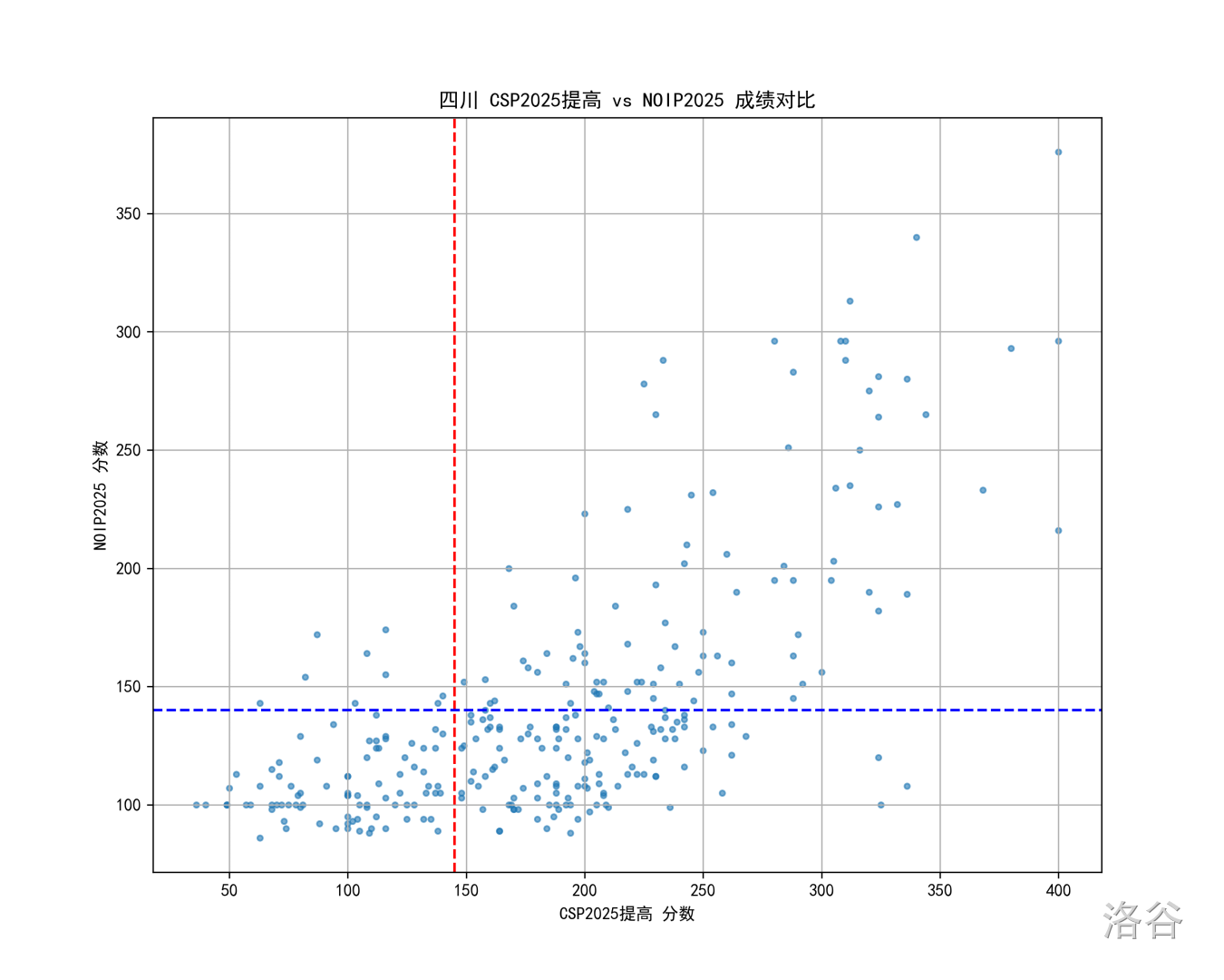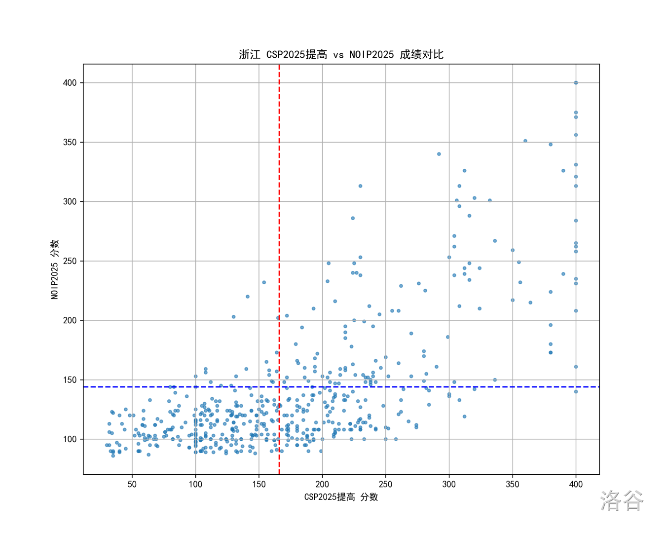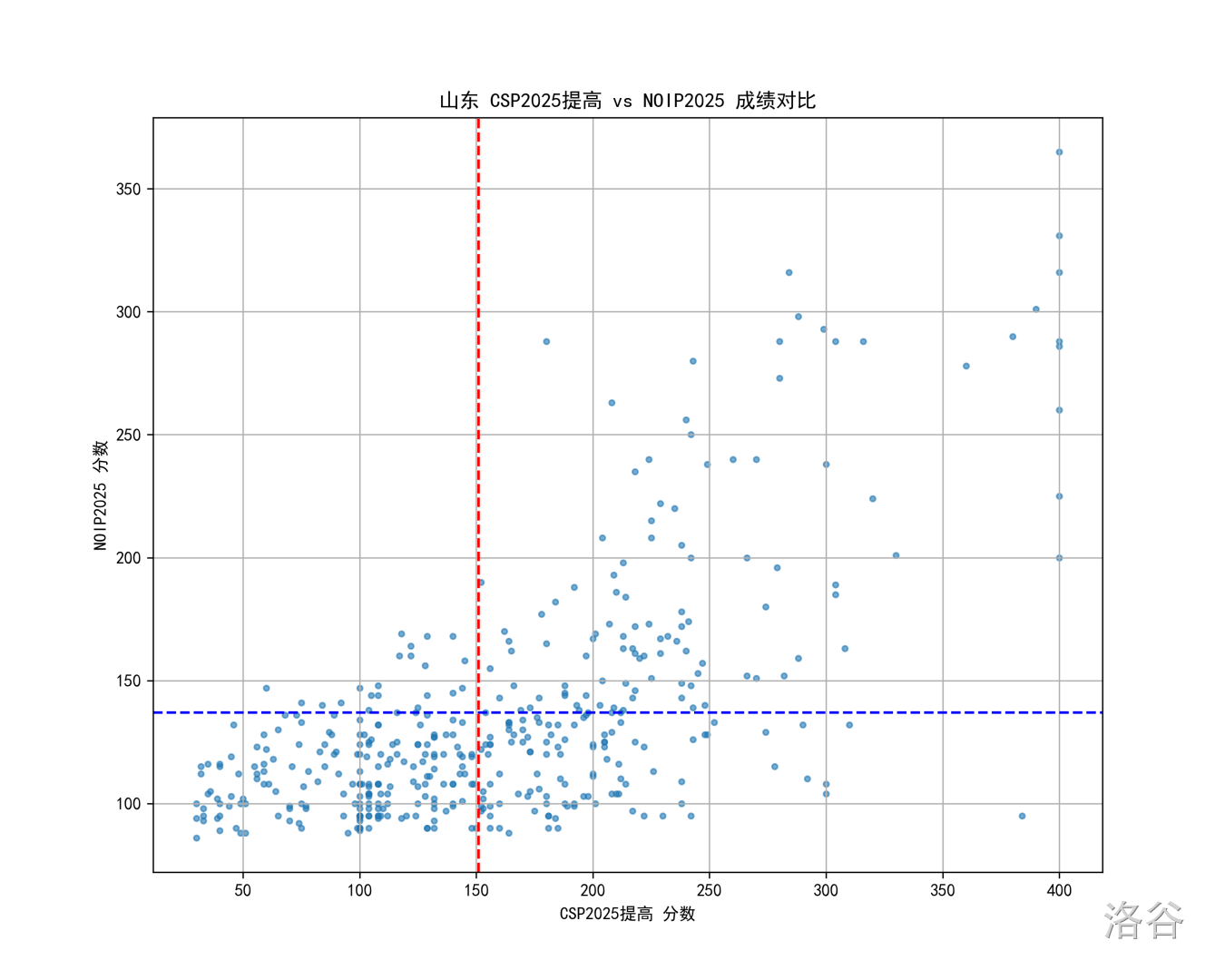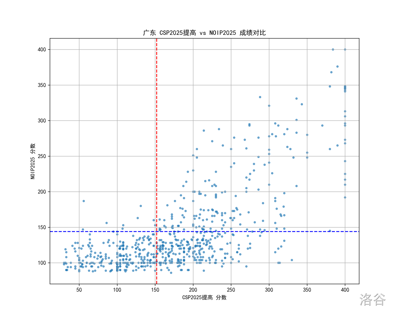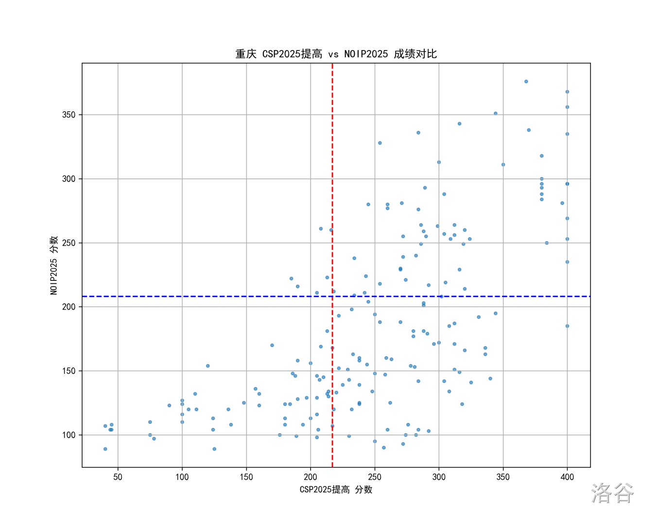 图中每个点是一个考生,红线和蓝线分别是 CSP 和 NOIP 的一等线。