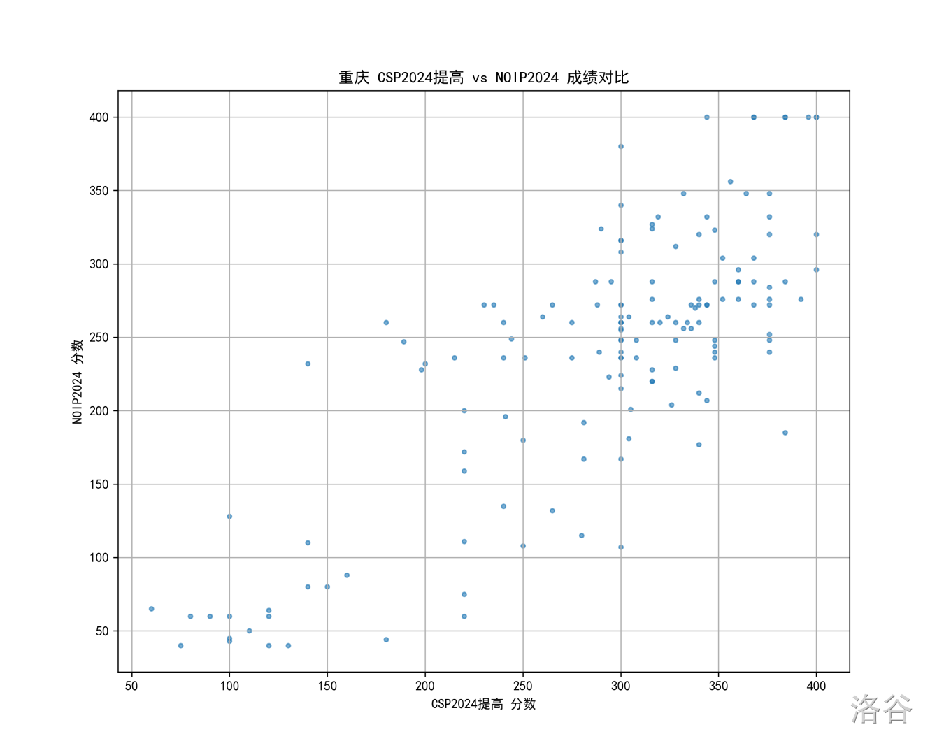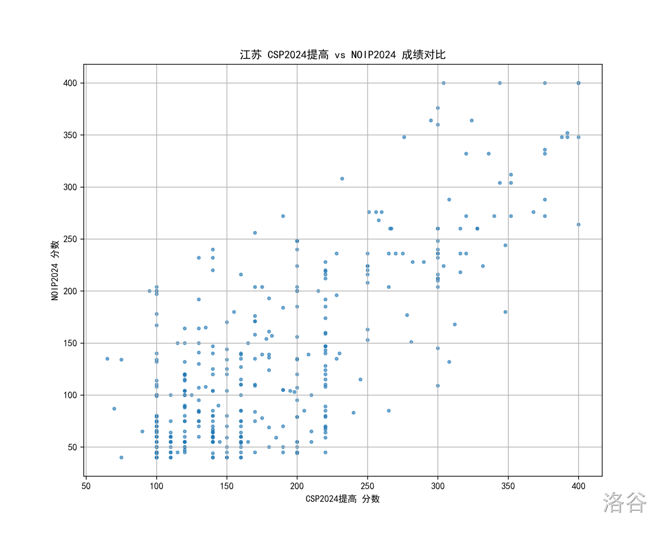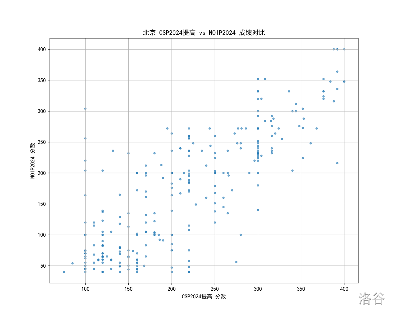 所以一个自然的想法是,我们看看往年的情况,比如 24 年的北京 CSP 对比 NOIP 散点图: