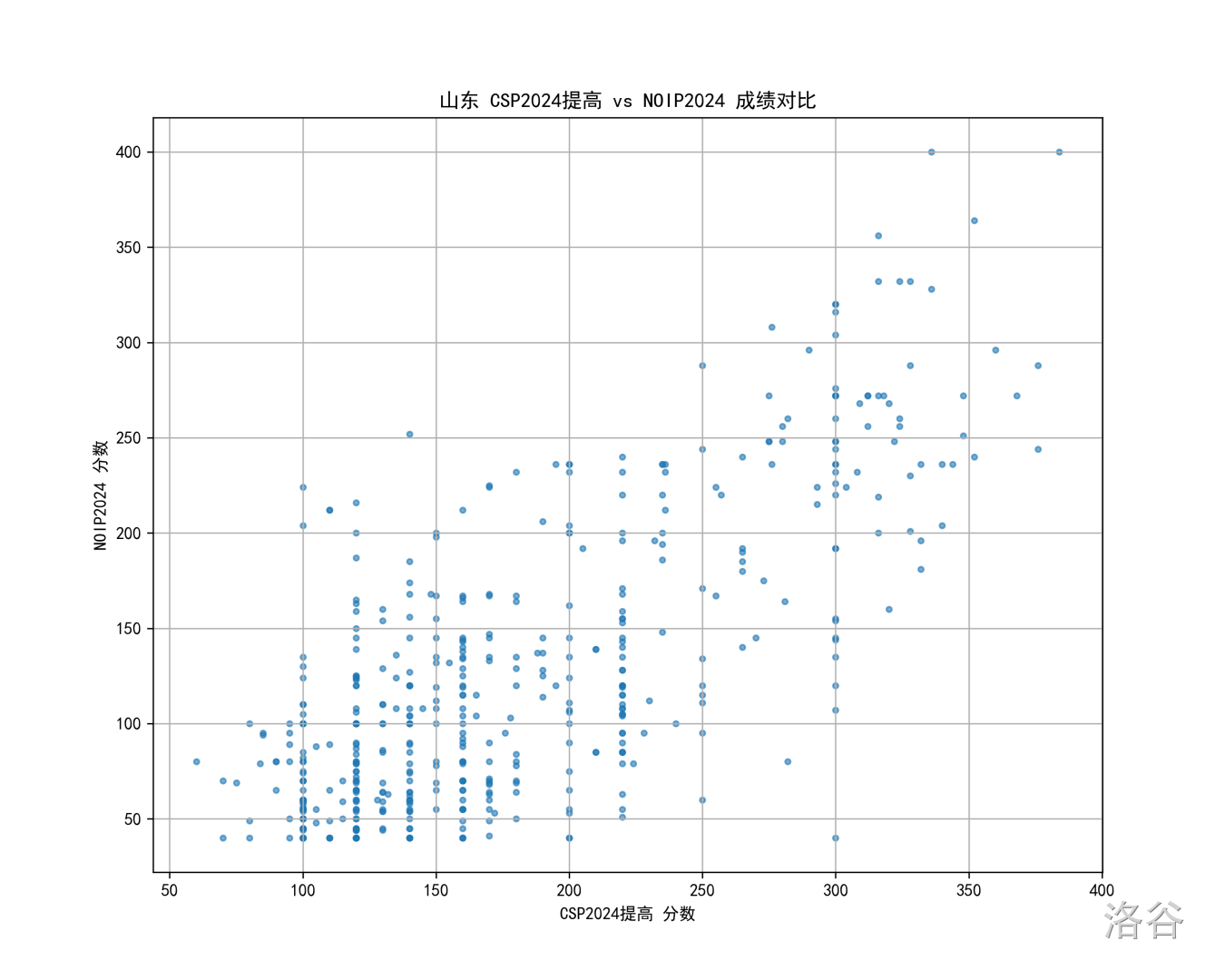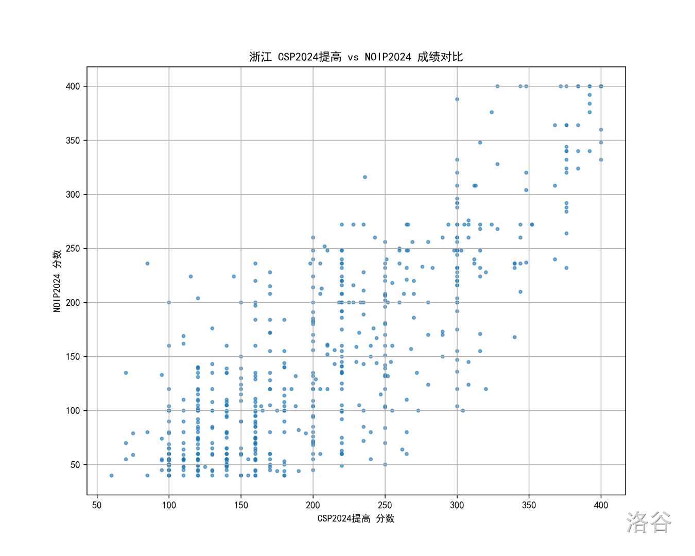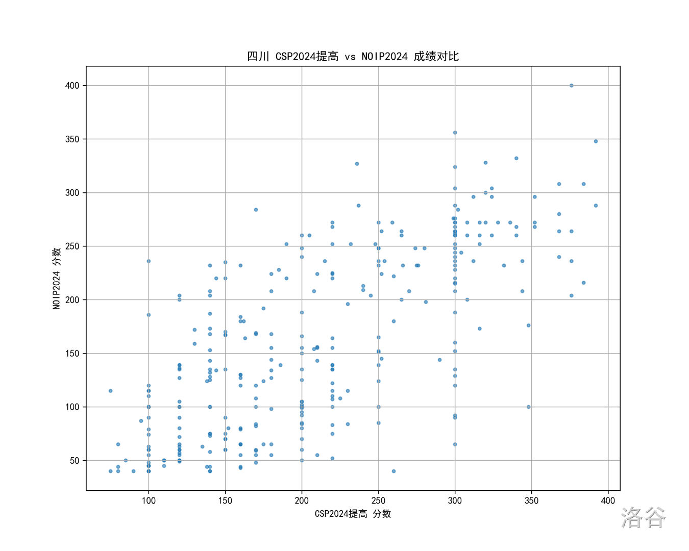 所以一个自然的想法是,我们看看往年的情况,比如 24 年的北京 CSP 对比 NOIP 散点图: