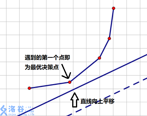 由于的值不随的变化而变化,因此该函数图像的斜率一定。这时我们可以把选择状态的过程想象为一条斜率一定的直线在坐标系里向上平移的过程。而因为每个不同的会带来不同的和的取值,因此每个决策点都对应了平面直角坐标系里的一个点。为了使我们这条函数图像的截距最小,我们在向上平移的过程中一定先选第一个碰到的点。