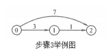 如下图所示,源点为vo,初始时S={vo},dist[1]=3,dist[2]=7,当将v1并入集合S后, dist[2]需要更新为4。