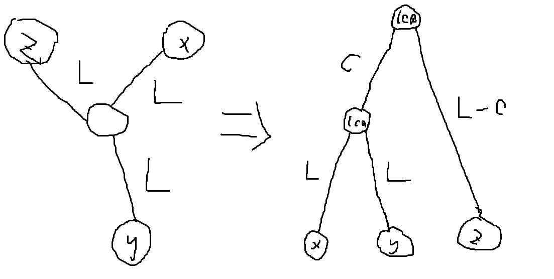 与弱化版本在三个结点间的路径的交点处计数不同,考虑在三个点 的最近公共祖先 处计数。则三个结点的位置情形必然如下图一般: