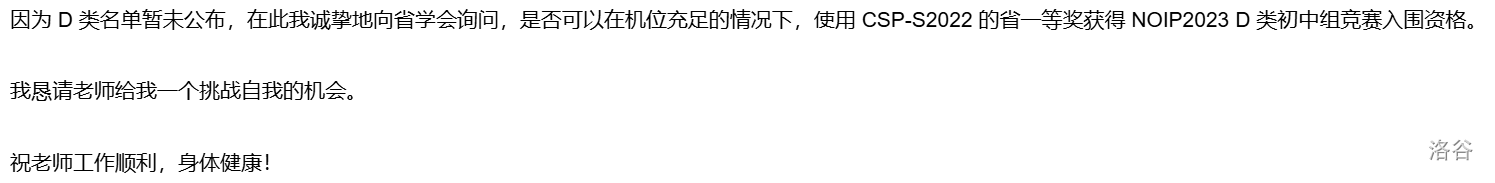 我反反复复地阅读着福建省 NOIP 的参赛资格,发现了文件里提到“需要拥有 CSP-S 一等奖”,却并没有明说是哪一年的一等奖!也就是说,我在 2022 年获得的 CSP-S 一等奖,或许能为自己赢得一个机会。现在看来,这样的想法十分可笑——组委会怎么可能会跟你玩文字游戏呢?但在当时,这就是我能看到的唯一的希望。我立刻给特派员写了邮件,里面附带了我 CSP-S2022 和 NOIP2022 的一等奖证书,以及我的 Codeforces 与 AtCoder 账号。邮件的末尾写道: