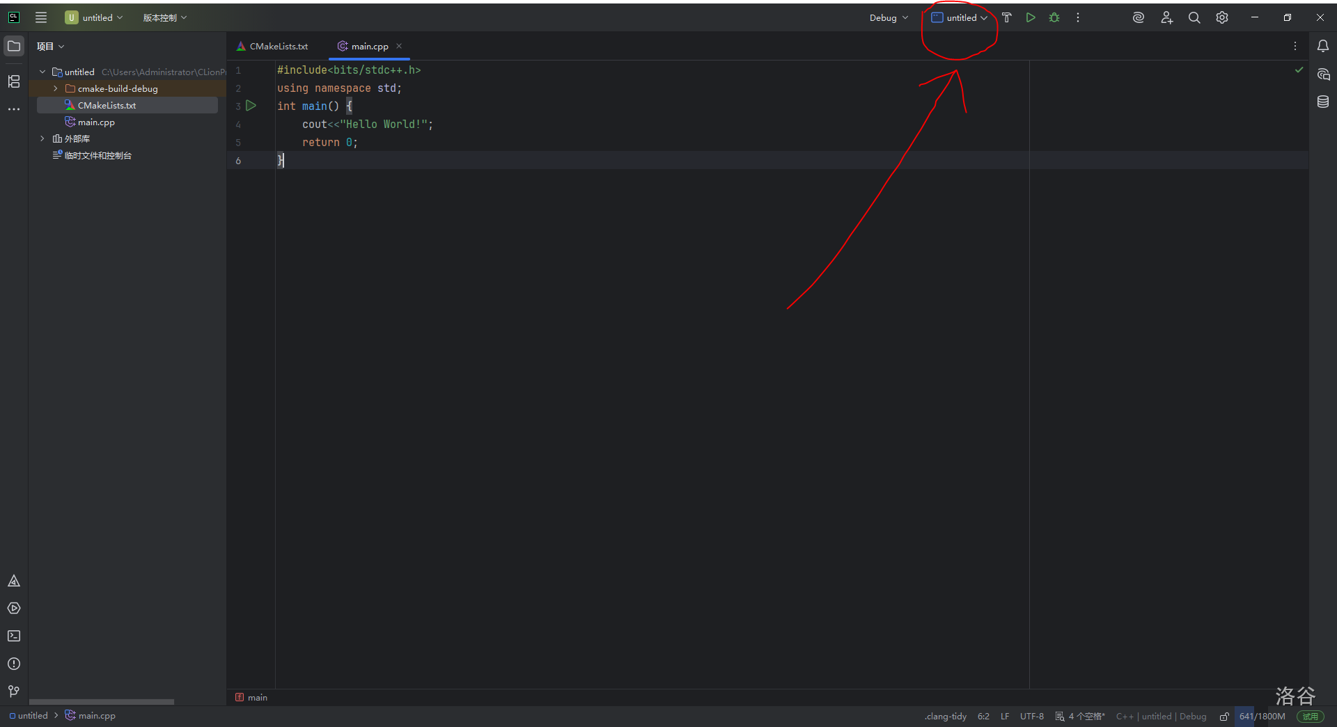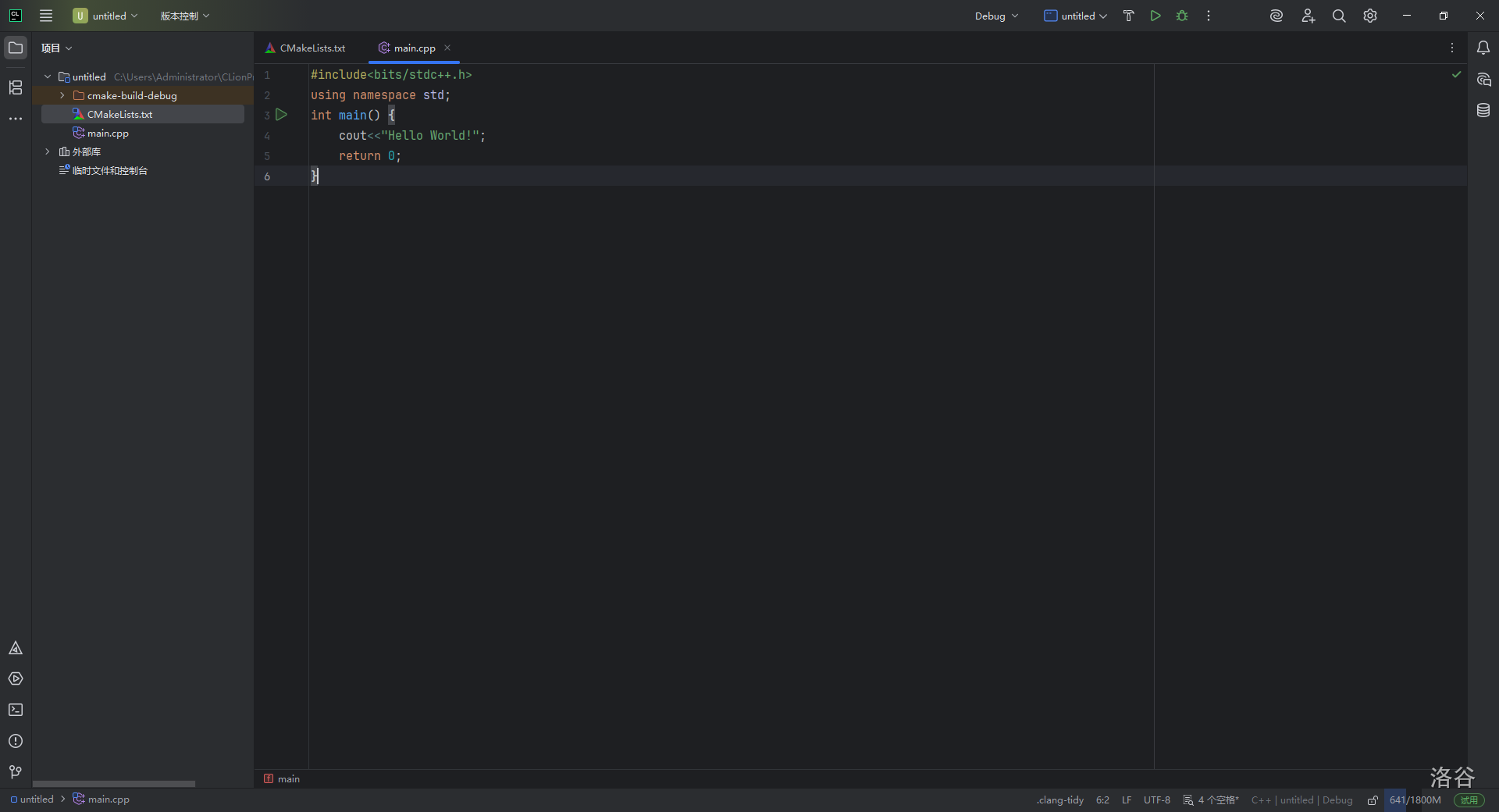 它会默认打开 main.cpp 和 CMakeList.txt,其中 CMakeList.txt 是工程项目在构建时会用到的东西。你可以选择把每一道题都当成工程来编写,但是难免会有些麻烦,所以我选择单文件编译。