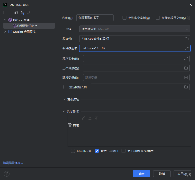 xxx.cpp”它就会自动给你配置出来一个运行配置,不需要上面说的那么麻烦,随后去右上角加编译命令即可。当然,你也可以按