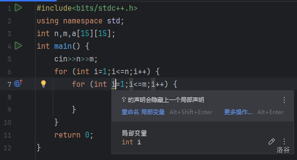 CPPi,你只需要在键盘上输入新变量名就能全部修改。同时旁边的小蓝圈也在提醒你这里出现了局部变量重名问题。同样的,还有下面这个代码:#include<bits/stdc++.h>