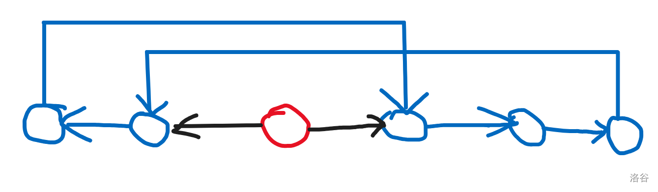 考虑研究环的形态。如下图,环一定形如两个相交但是不包含的区间,且靠前的区间方向向右,靠后的区间方向向左,此时选取相交的部分中的点(不包含边界),都会产生环。故相交的部分都不合法。