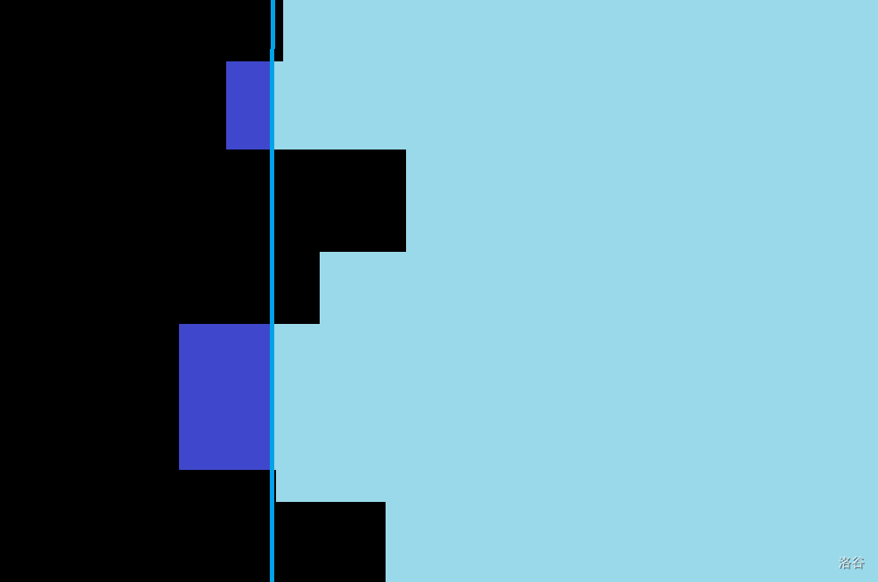 现在,把纵轴看成是时间轴,横轴看成是值域,蓝色部分打上 的权值,则问题转化为了在某段时间中求值域上的一段前缀和。