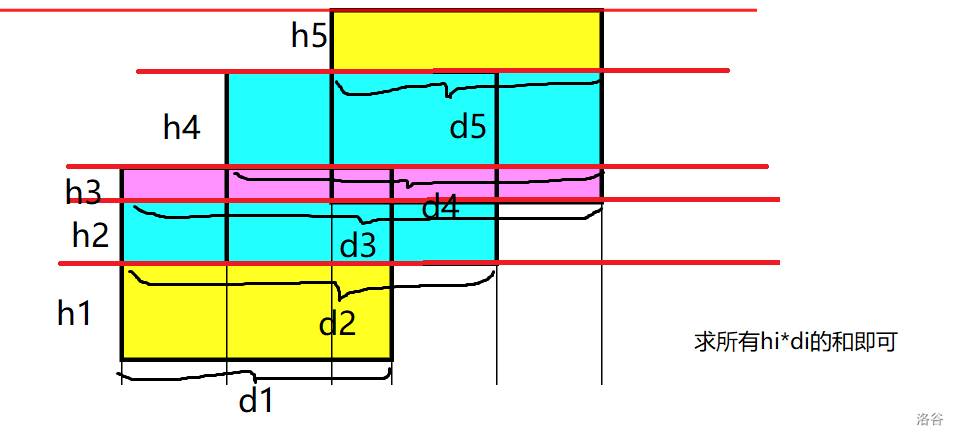 最后,数轴上大于零的位置证明被覆盖,需要计算,而等于零就证明没有被覆盖,显然不能小于零(可以看看动图中的 数组)。得到所有大于零的位置覆盖的总区间长度后,我们也就得到了要求的小矩形的宽(实际上矩形的说法并不严谨,但通过平移,要求的每个小形状可以等价于一个矩形)。