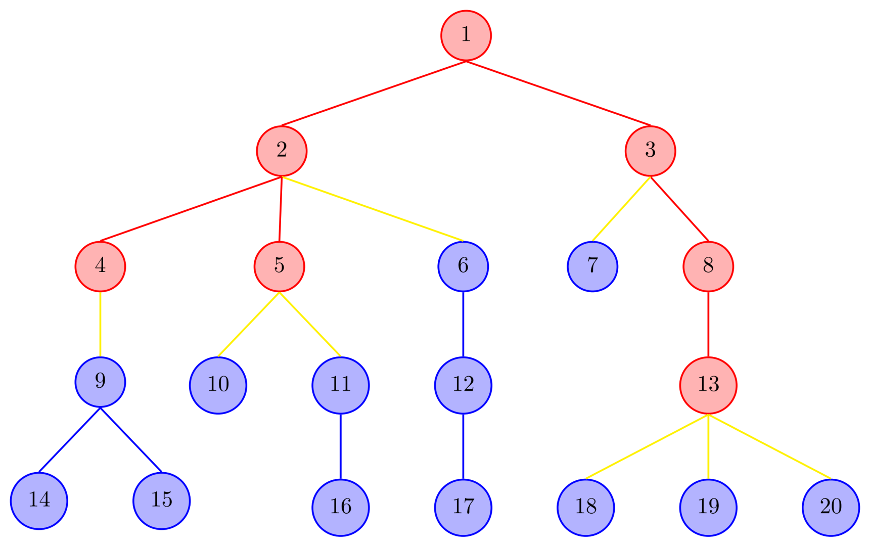 考虑所有蓝边,我们可以得到若干 极大蓝子树(图中有蓝点 6, 7, 9, 10, 11, 18, 19, 20 的子树)。根据上述 自然的观察 2,大小为 的子树内部对时间复杂度的贡献不超过 。假设这些 极大蓝子树 的大小为 ,则:
