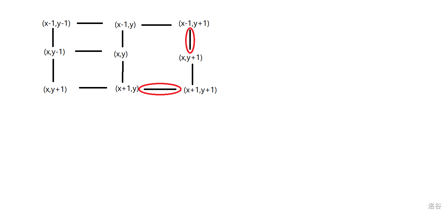 dp,所以先把周围都清除成无穷大。(这里有一个坑点就是一开始 的大小只到 ,如果再加一就会 RE,所以前面的定义要改)这里的含义变了(重中之重!),设 表示的意义为“跨越某条切口(横/纵)的最短绕行代价”,从直接穿过和向右/下绕行取最小值,所以转移方程显而易见。