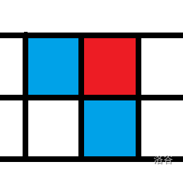 要求联通块的数量,等价于求联通块的边界数量再除以 ,于是,我们考虑求边界对每个区间的贡献。由于行数只有 ,所以我们可以简单分讨下边界的形态(令红色为一定在区间中的格子,蓝色为一定不在区间中的格子,白色为我们不关心的格子):