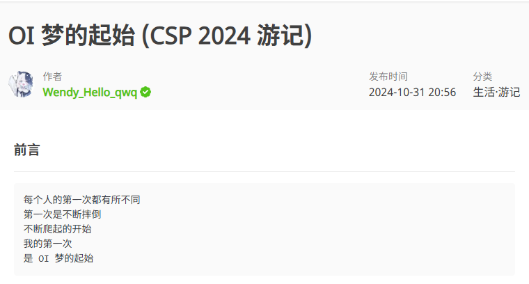 这次 CSP 我没有参加 S 组,在中午回家的路上,看着晃眼的阳光,被突如其来的乌云遮蔽了光芒,就好像我的 OI 之路,被突如其来的初中生活打断了脚步。也许爸爸是对的,这门技术就是筛选的过程,学不下去就要被淘汰。没错,这个东西很花时间,在这里没有什么惊人的成绩,就不干了吧。