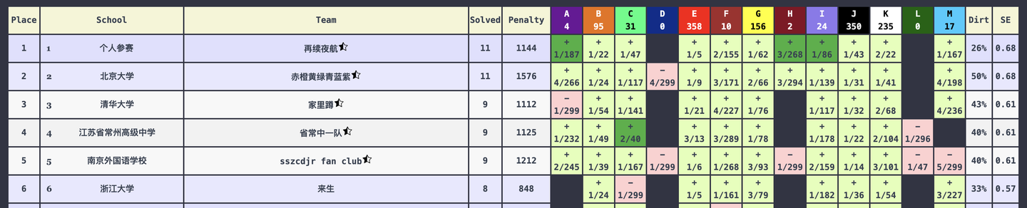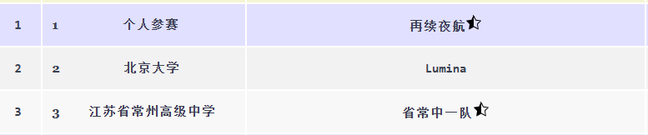 省常中一队 排名 rk4,n+1 了正式队的冠军,落后 rk3 的家里蹲 13 分钟的罚时,另外前面还有两个超模队,大概是情理之中地输给了前面 3 个更有实力的队伍。Lumina 好像发挥得非常不好,最后会了 4 个题,写了 3 个题,但很遗憾都没能通过。