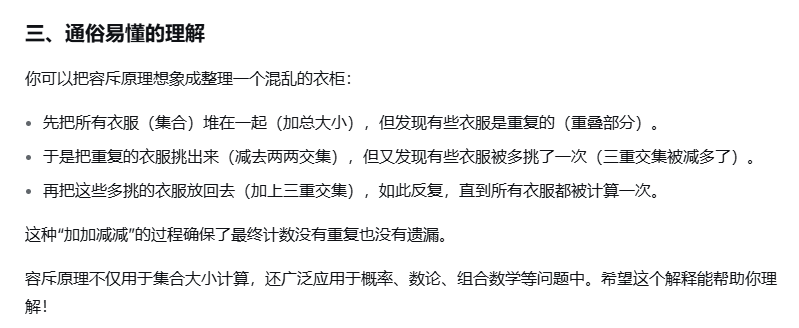 - 首先,我们既然要做容斥,就要知道容斥的公式:总体方案数-最多可能重复的种类数+次多可能重复的种类数……;