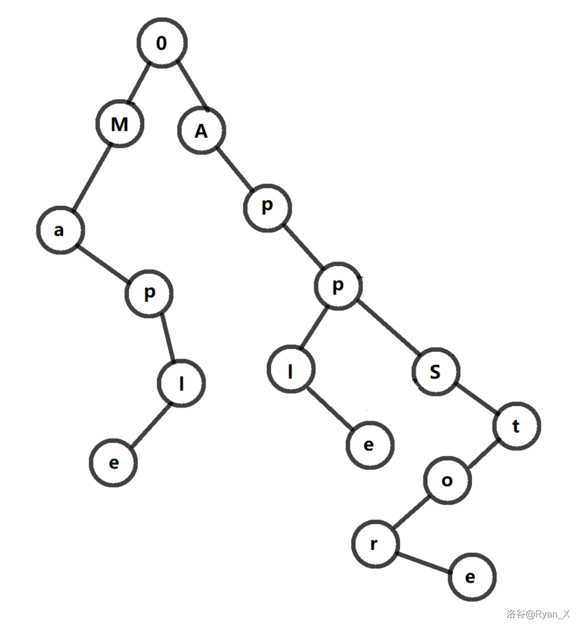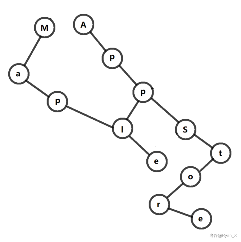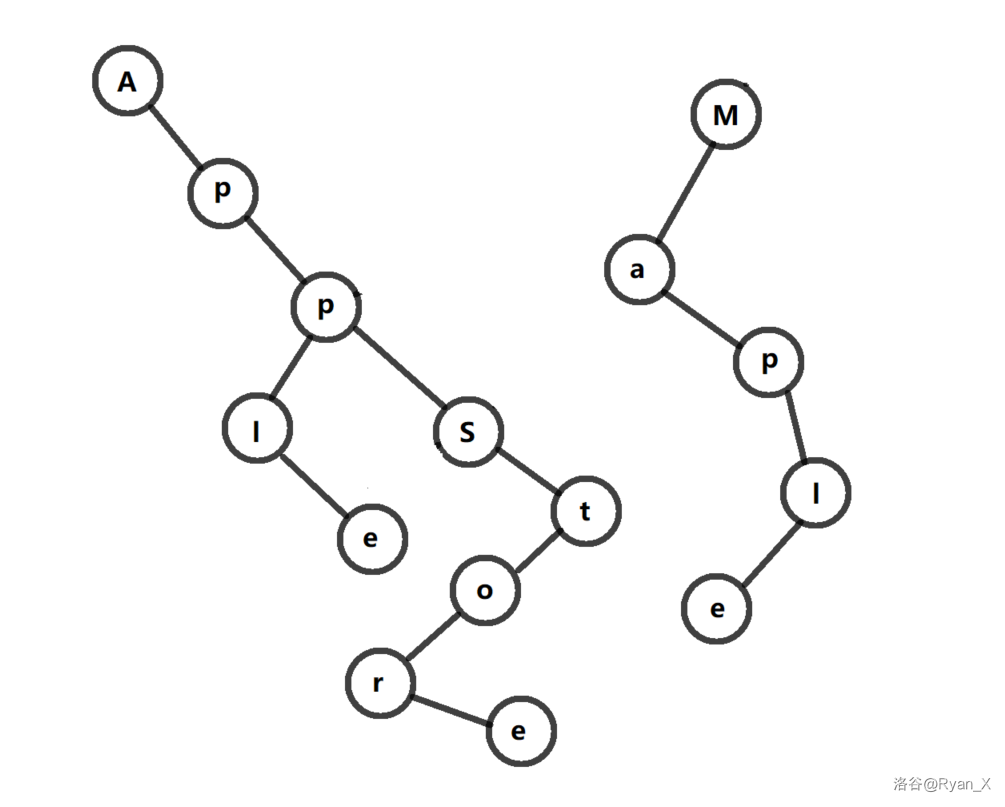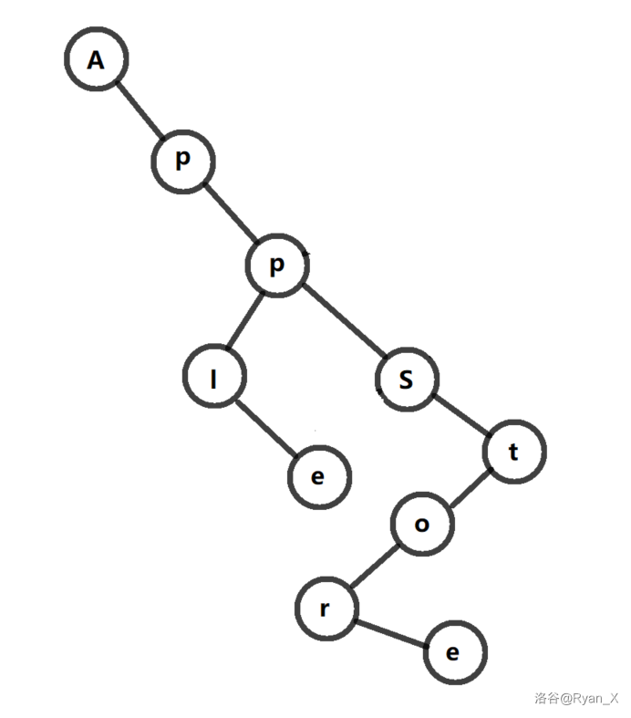 这样一条树链就表示了 Apple 这个字符串。然后我们再添加一条树链: