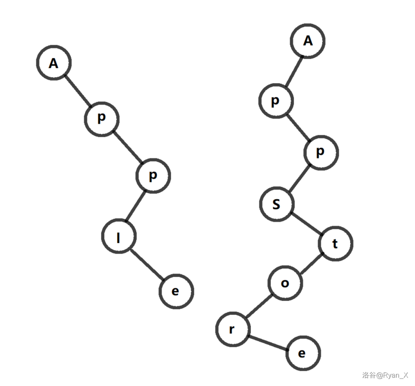 我们发现这棵树包含了刚才的两条树链,且比刚才省去了一个前缀 App。通过这种操作我们就达到了省空间的效果。尝试再加入一条树链: