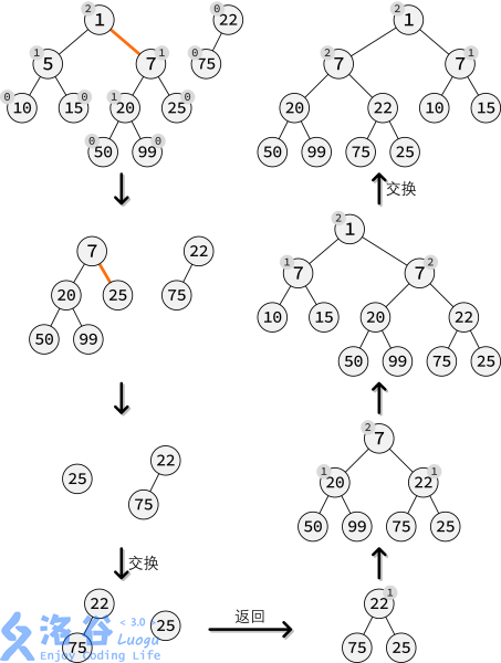 这里先解释一下,一般来说可并堆是不支持删除某一给定权值的点的,因此我们这里说的任意节点是指知道编号的任意节点。首先和根节点一样,先把删除节点的权值赋为,然后合并其左右子树得到新的左偏树,我们再把得到的这个左偏树接到删除节点的父节点上,同时维护父节点的子节点信息。但是,删除掉节点后我们可能会发现不满足左偏性质了,那么我们就需要判断是否需要交换左右子树,并且要一直向上重复判断,直到到了某一结点时左偏性质没有被破坏了或者已经到了根节点。