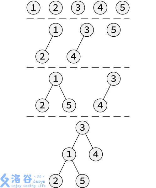如果我们直接一个一个的来建树也没有什么问题,但是这样显然效率非常低下(算上,这样建树复杂度是的)。我们可以稍微优化一下,把每个节点当作节点数为的左偏树存入队列中,然后每次取出队首的两个左偏树合并,把合并后的左偏树放入队列,重复操作直到队列中只剩下一个左偏树。如图:(图中未注明权值)