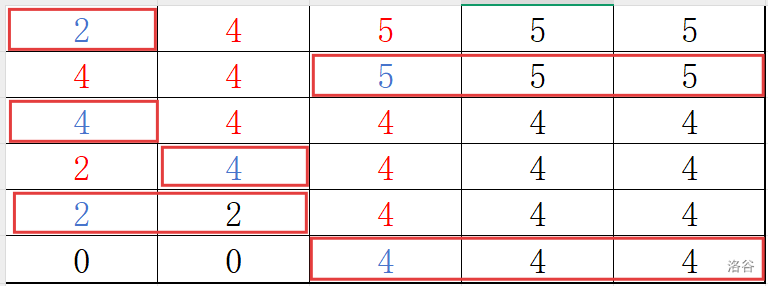 这个是题目给出的样例,从下往上第 行对应进行第 次操作后的 序列(如红框代表第 次修改完后的 序列)。其中标红数字的是每次的修改。