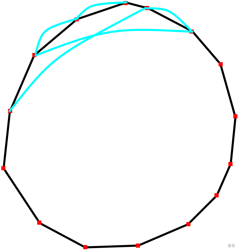 所以我们可以采取贪心的策略:两边交替向下,路径不相交,直到将整个圆环全部走完为之。所以我们先找到最高点,并记录编号为 ,再由该做法设出: 表示从左边下了 步,从右边下了 步,目前在左边/右边的最小距离。状态转移方程为( 记为编号 两点的欧几里德距离):