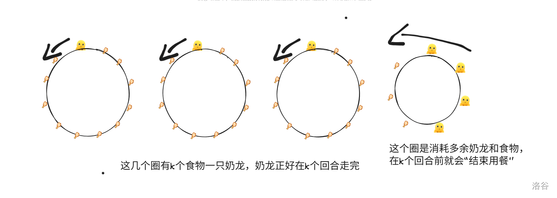 而如何构造方案?我们可以给 个奶龙开包厢,做包含这只奶龙和 个食物的环,使他们正好能在 个回合访问完它们所在的环。剩下的奶龙和边角料都放一个单独的环,龙多饭少肯定 个回合前就吃完了。下面给出例子: