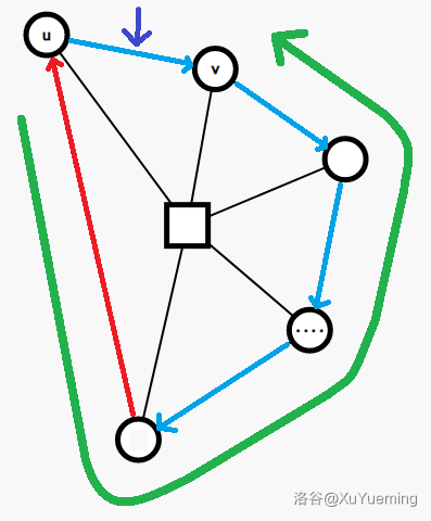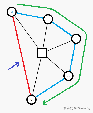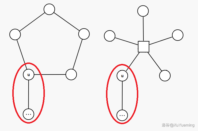 是走进一个点双,再从中走出来,圆方树上,我们为每个点双建立了一个方点,这不就相当于从 走到 对应的方点,再走到 吗?进一步地,这不就构成了圆方树上一条以 为端点的树链了吗?我们于是自然得出了圆方树和原图之间的对应关系: