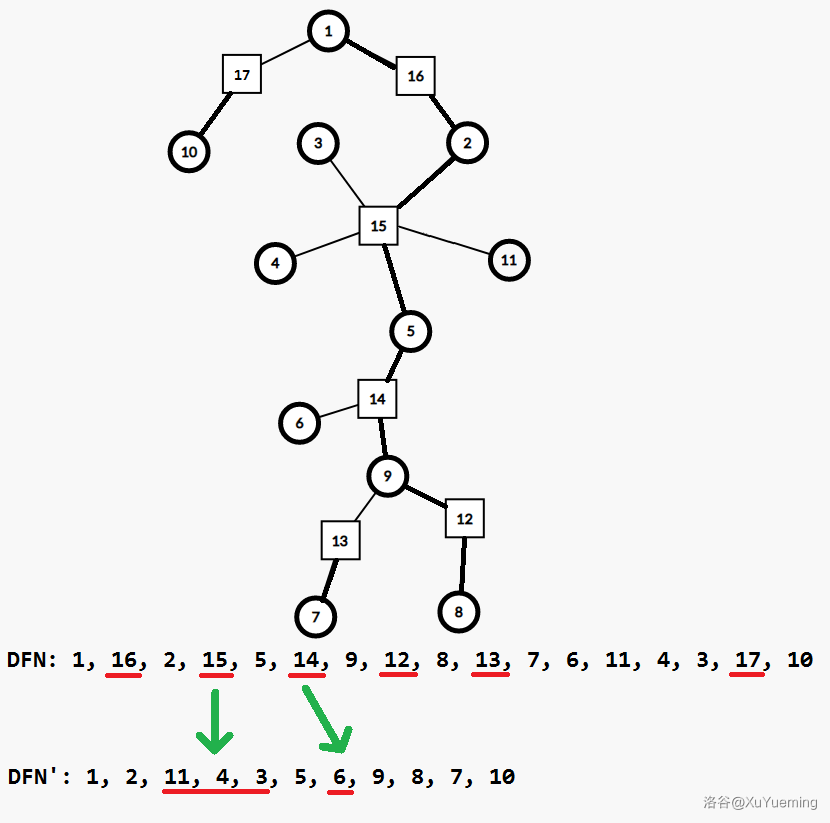 在圆方树上,一个方点的父亲一定是圆点,我们称这个圆点为它的 「父亲圆点」,类似定义 「孩子圆点」,对于一个圆点类似定义 「父亲方点」,「孩子方点」。