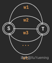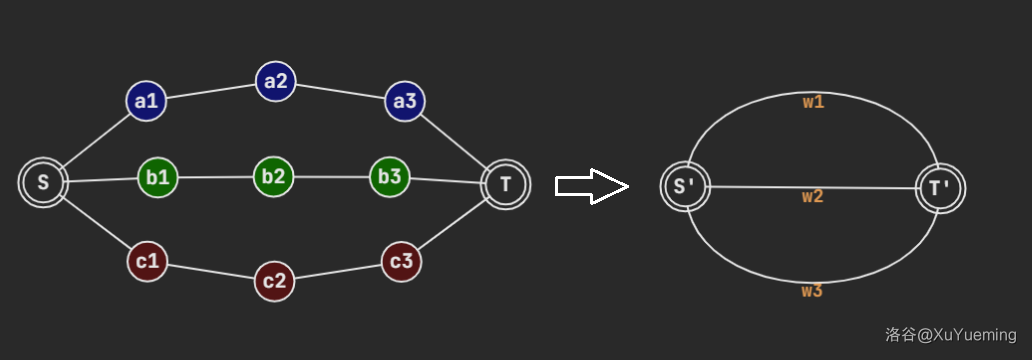 这个点双在一个简单环的基础上多了一条简单链。 我们假设多出的一条链的两端是 。那么他们之间就被三条简单路径连接。为了方便起见,我们把这三条链看做是连接 的三条边,边权对应简单链的边权和。