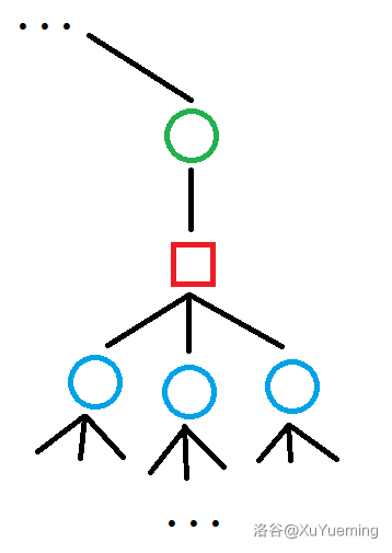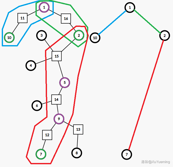 当我们经过某一个圆点(蓝点),跳向它爷爷(绿点) 时,需要求的是 和 的原子信息 。不考虑修改的情况下,每一次从 跳到 ,原子信息都是相同的,因为它的爷爷 是唯一的。我们于是这可以预处理出这些原子信息,而这类原子信息的个数和非根圆点个数相同,是 的。我们将 和 的信息,放在 到它父亲方点(红点)的边权上,每个方点和它父亲圆点之间的边权设为单位元。那么我们考虑一对具有祖孙关系的节点,他们之间的信息,便是圆方树上他们之间边权按序合并的结果。