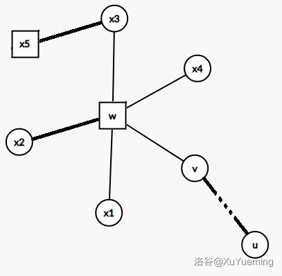 有了合并信息的方式,我们要考虑 「原子信息」,即小到不能再小的信息,此时就是 处在同一个点双的时候,我们不能找到一条连接 的简单路径通过某一个割点 ,于是不能通过合并信息的方式得到 的信息。不妨对于处于同一点双中的 ,用 表示 之间的原子信息。原子信息通常是能够方便处理出来的。