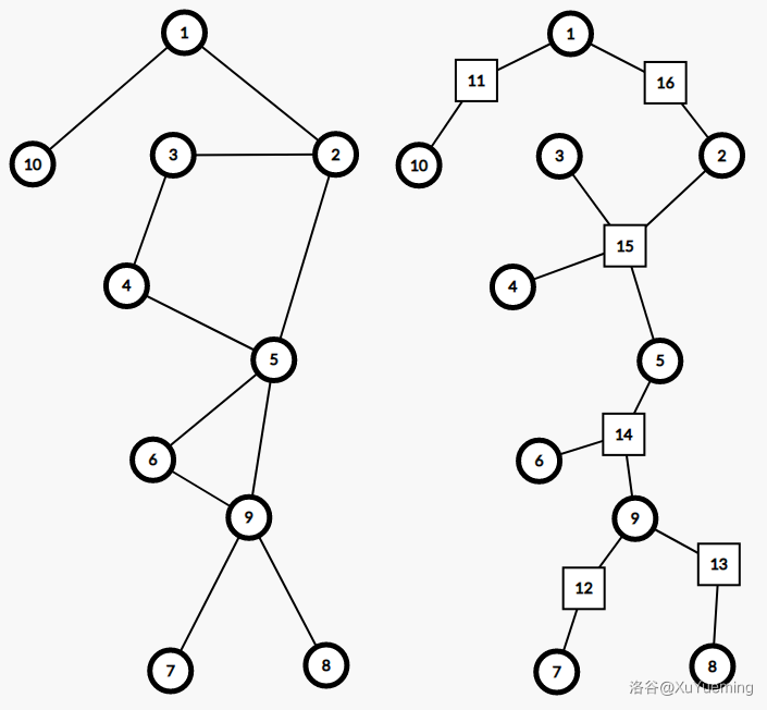 以下展示的是一张无向图及其对应的圆方树结构。例如,原图中点双 对应超级节点 ,在圆方树中, 和 都连有边。