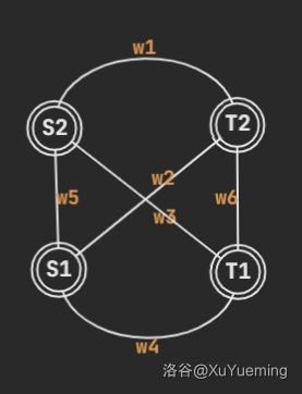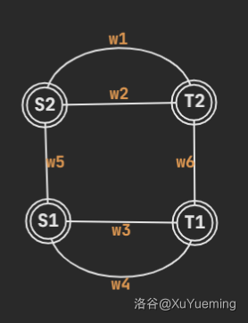类似地,这里存在六个环:令 ,看看能不能导出什么矛盾。手玩一会后发现,由 ,得到 ,而我们的边权都是正整数,所以这是不合法的。也就是说,一个点双的结构不可能是这样。有趣的是,如果我们令 ,那么这张图相当于退化成了 case 4 中 条链的情况,这似乎在暗示我们 case 4 或许就是我们要找的性质。 -