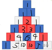 每个方块都会对它左上和右上的方块造成影响,因此一个方块的贡献是左上方块和右上方块贡献次数的和。边上的方块肯定只能贡献一次,而这听起来非常向杨辉三角,而事实上它就是。