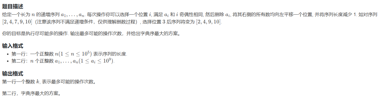 由于是场切,所以就简单说说,我们只用知道这玩意从前往后和从后往前枚举都能得到一份答案,但是可能不会满足字典序要求,所以我们首先将枚举顺序确定为从后往前,然后有发现只要删掉一个数它后面所有没删成功(也就是奇偶不一样的那几对)的数都会被删掉,这时我们删掉的顺序也和我们遍历时的一样,从后往前,当然你一边枚举一边记录失败的数更方便。