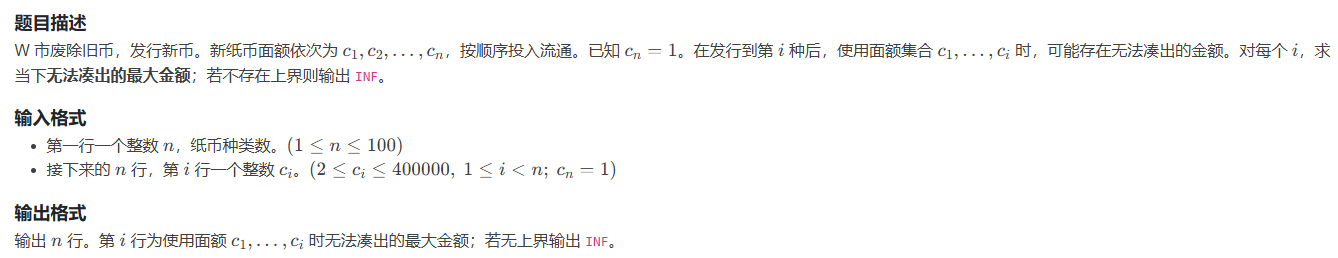 首先,啊~~我们要知道一个结论,就是我们从中挑一个最小面额的当除数,然后枚举它所有可能的余数,然后找每一个余数对应的最小可以被凑出的面额,将这个面额减去除数(也就是最小值),得到的就是最大无法凑出的面额,这个玩意叫Frobenius扩展定理,原定理是只有两种面额,这里的话证明如下: