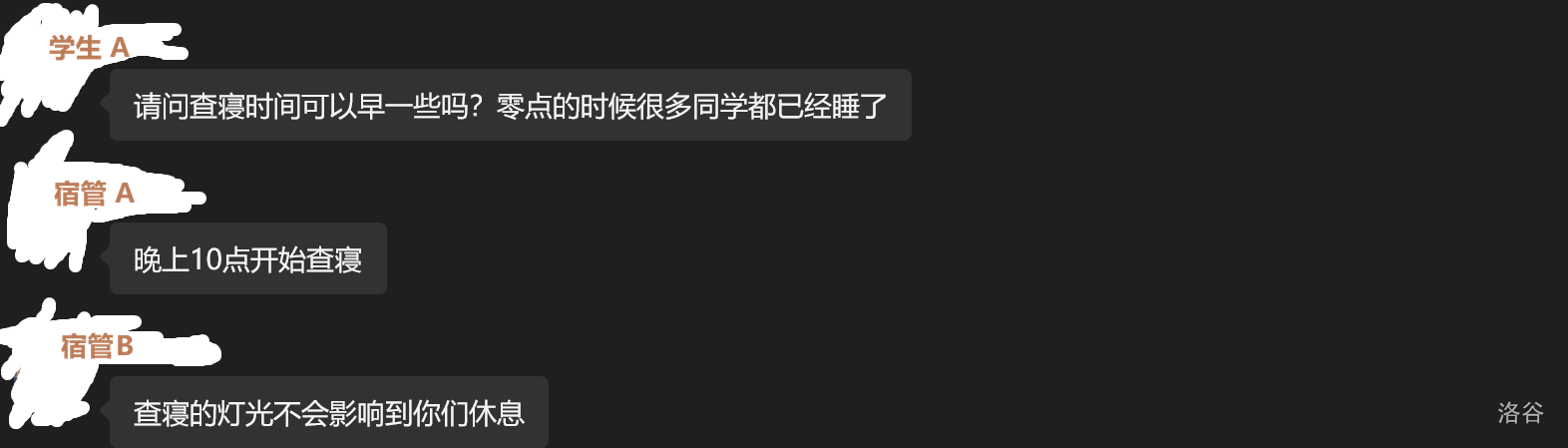 然后晚上宿舍群里面有同学问可以查寝早一点吗?然后宿舍的回答: