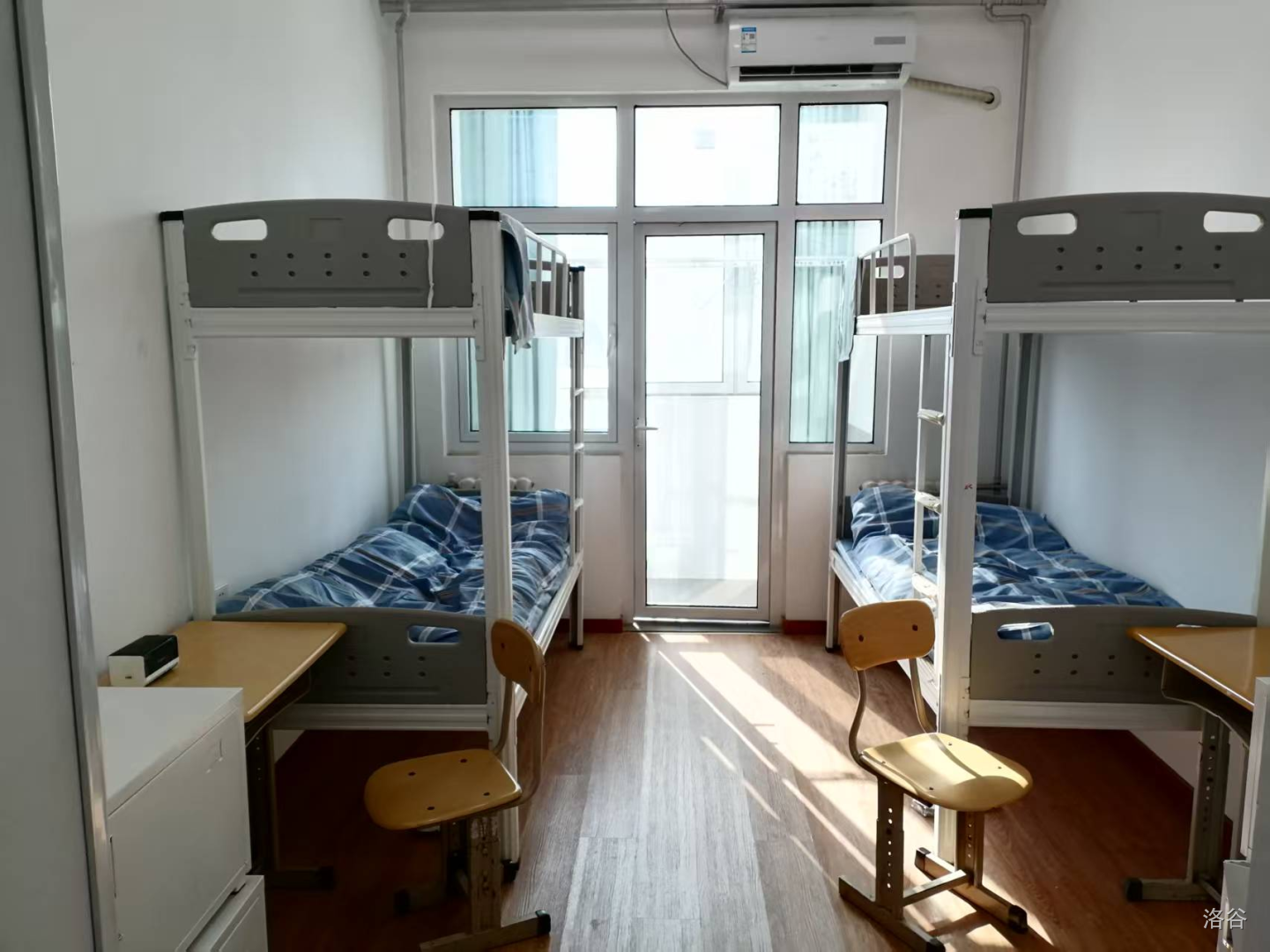 听他们说今年宿舍条件没去年好,不过我去年也没去过,我也不知道。不过宿舍一共 楼, 楼是双层床, 楼是单层床。每间寝室都有四张课桌当桌子以及几个小小的柜子。卫浴独立,但是都很小。听说我们住的是 cyyz 原本的女生寝室,因为男寝太乱了啥的。