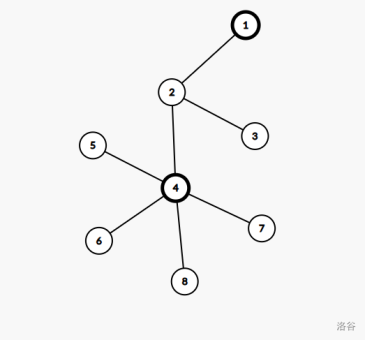 如上图, 号点分别有 条路径,各自往其父亲—— 号点处上传了 条路径。 号点原先需要 条路径,但消耗了来自 号点的路径各一条,实际上产生了 条路径(把原先的两条路径拼起来覆盖 号点的需求,相当于少了一条); 号点上传的路径还各自有 条,拼凑起来又省了两条。答案为 。其中前一个 是两个儿子上传到 的共两条边满足了父亲的需求,后一个 是两个儿子剩余上传的四条边相互拼凑所节省的路径。