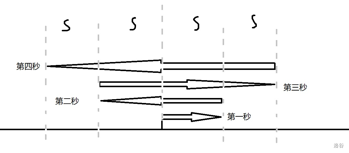 i 个粒子的位置在 p[i],速度为 s[i]。粒子的初始方向由其粒子性质决定,正粒子初始方向向右,反粒子初始方向向左。当 Bessie 看向这些粒子的时候,它们的方向会被改变。Bessie 会在实验开始后的第 1 秒,第 3 秒,第 6 秒……看向这些粒子。综上所述,一个正粒子的运动轨迹大致如下(反粒子方向相反):