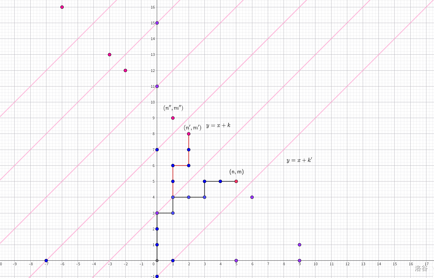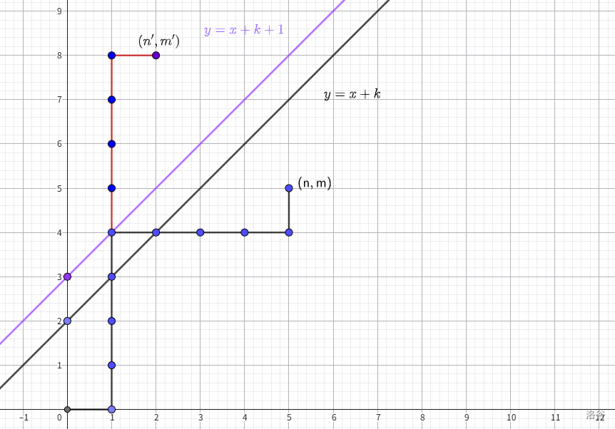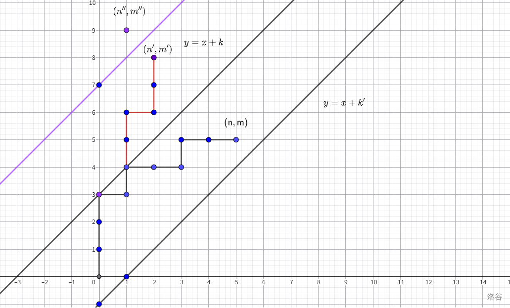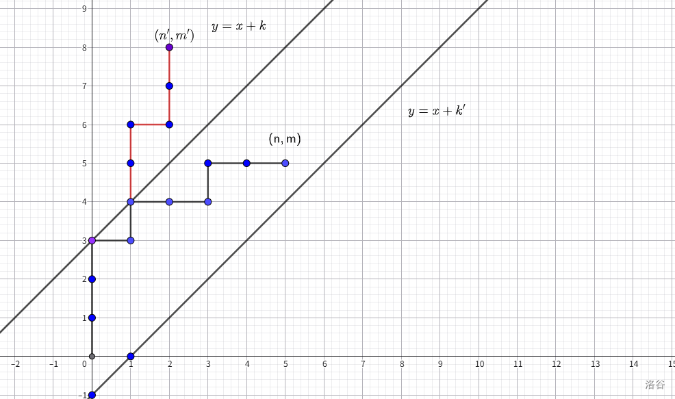 也就是说,对于不越过 的情况,不合法方案数相当于作 关于直线 / 对称得到 后, 到 的路径数。