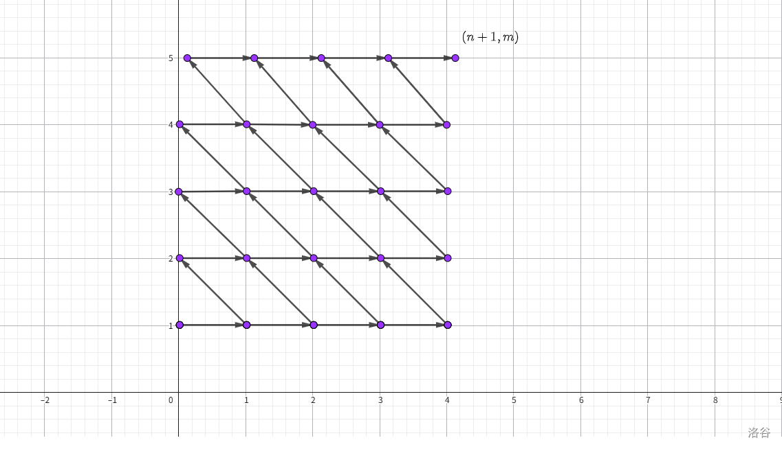 还有一个问题是向右上走需要乘上 的权,所以不完全是自由路径数。但是已知起点 终点 ,容易得到向上走了 步。