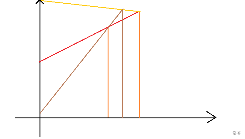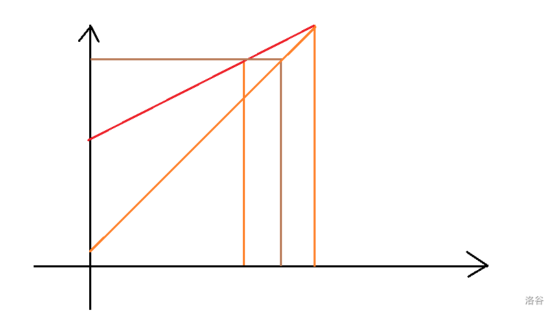 首先,我们考虑只有两栋建筑物,最高能到多高,仍看不到所有建筑物。如图所示,显然两栋建筑物的顶点连线与 轴的交点,就是最高的高度。因为一旦高度更高,我们与第二栋建筑物的连线就不交与任何建筑物,就能看到了。
