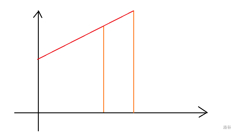 于是我们得到结论,对于每一栋建筑物,我们只需要考虑与其相邻的建筑物,连线,并找到与 轴相交点的最大高度即可。