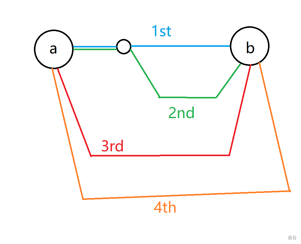 记重合的这条边为 ,则需要再补充两条开头不为 、结尾不同的路径,就可以满足上述的条件: