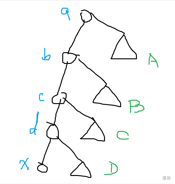 考虑 K 树性质,对于某个点对其权值为 LCA 的权值。那么对于一个点 不断往子树上爬父亲时,其兄弟子树的所有点到 的距离 恰好 等于当前父亲的权值。比如说从 爬到 ,那么从 到 的其它子树的所有点的权值都等于 的权值。