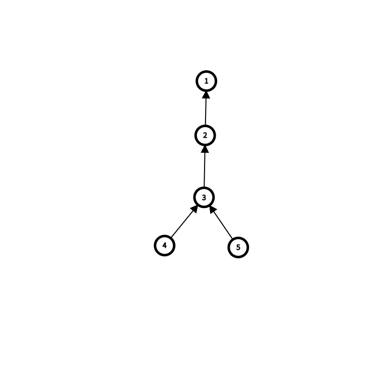 很明显在二号点出现“入不敷出”的情况之前, 号点最终的数量只和 有关,因为一直是满流。但实际情况可能是来自 345 的流向了 1。但这并不重要,因为我们只关心流了多少而不是来自哪里。当 2 号点不够了之后,实际就是全部的流入都来自 345,相对应的单位时间的流入大小也有改变。那么怎么维护这个信息呢?可以直接把 345 直接连向 1 号点,然后把他们的流量信息合并到 1 号点,这一过程可以并查集维护。
