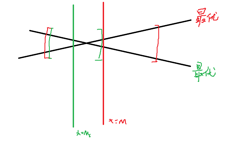 若 ,与上图情况相同,其可能在左区间成为最优线段,而右区间不可能。向左区间递归插入。